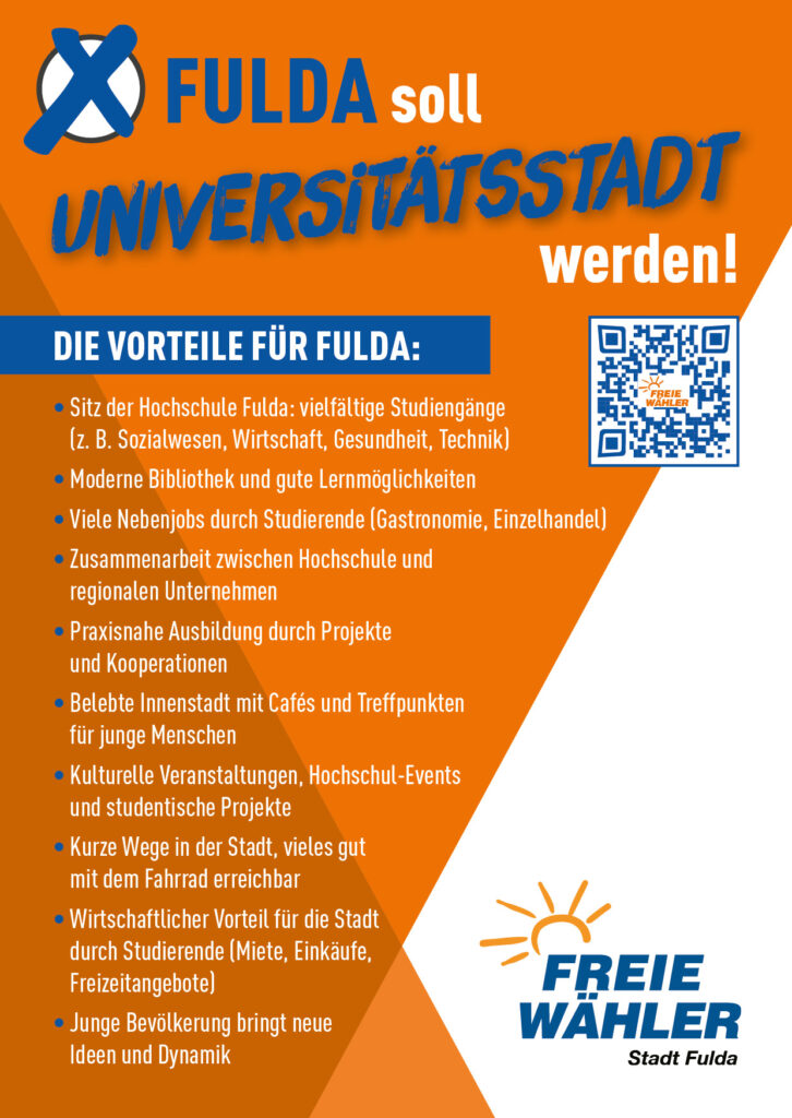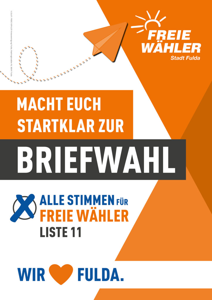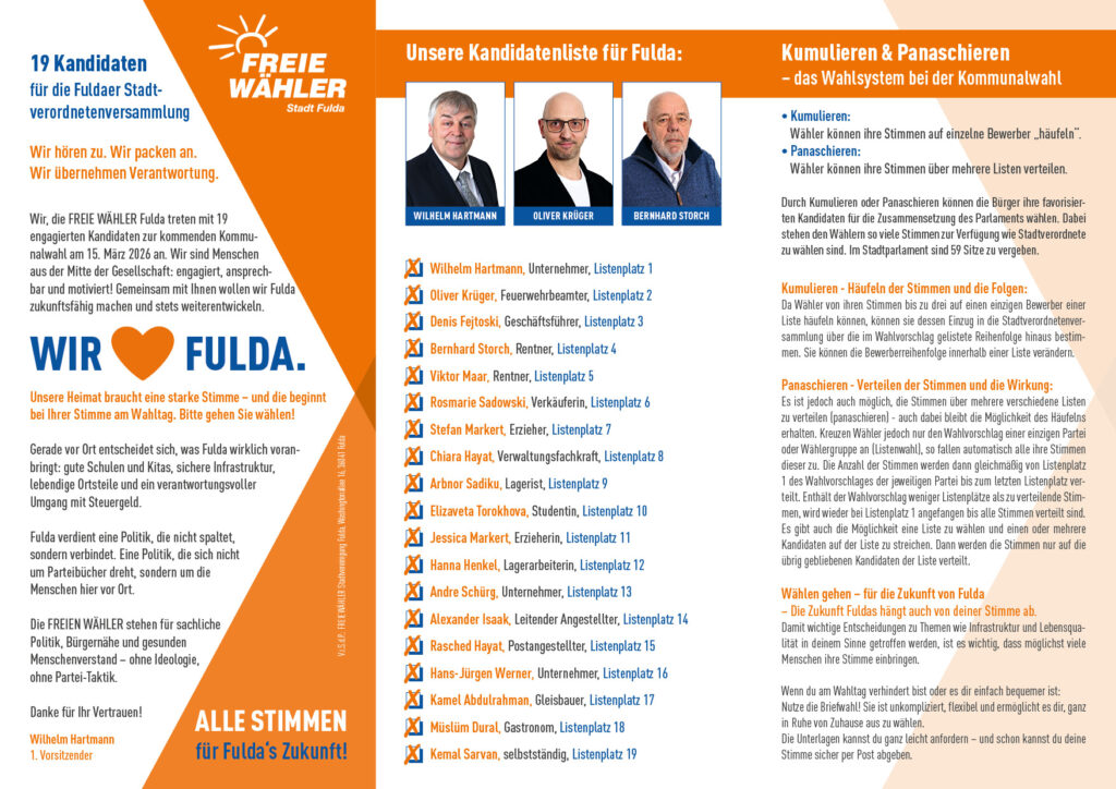 Kommunalwahl 2026Start / Kommunalwahl 2026 Aktuelle Pressemitteilungen: Januar 2026 Februar 2026 Jetzt Briefwahl nutzen und FREIE WÄHLER wählen: Unser Ziel für die Stadt Fulda: Unser Wahlprogramm 2026: